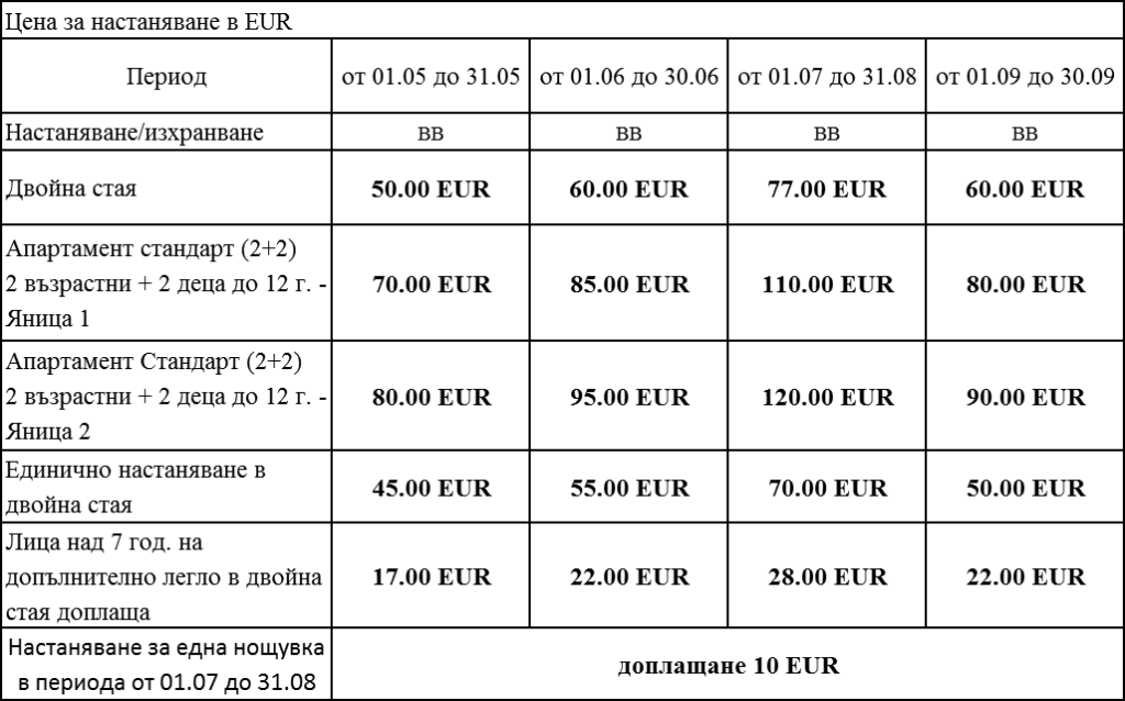 Цените са в EUR за помещение за съответния брой хора и включват: